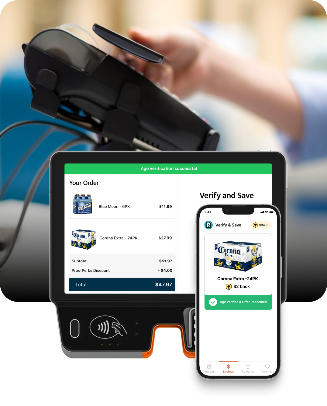 Tap your phone to verify your age and apply deals at the register with your ProofPerks Passport.